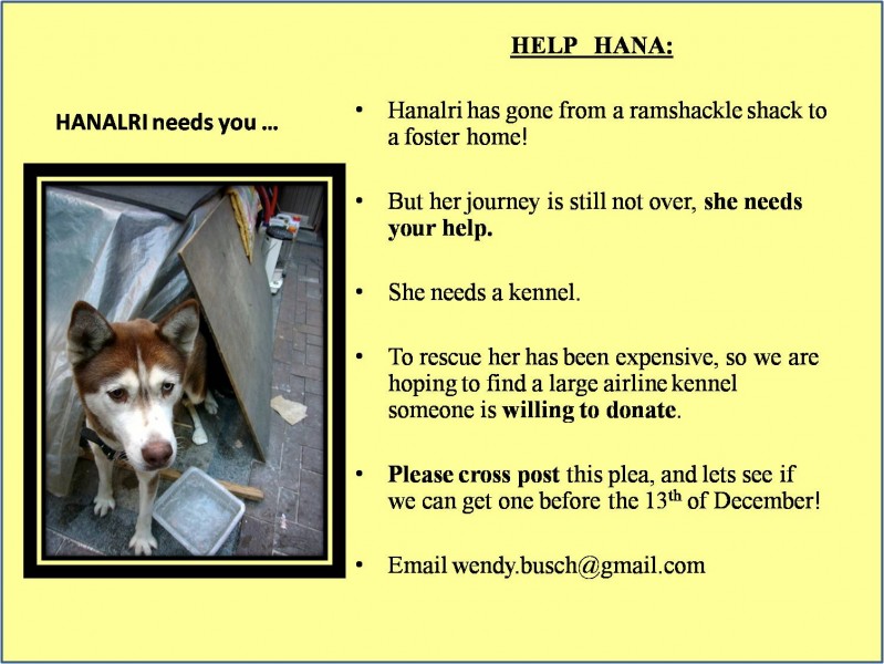 Several ARK members, including myself, have been working on rescuing a chained dog from Seoul for the last two years. She has finally been taken in by a wonderful foster mom, and is doing well. We now have a family that would like to adopt her in the US. The cost of shipping a dog overseas is expensive as most of you are aware. We are trying to curb our costs as much as possible, and are looking for an AIRLINE APPROVED LARGE DOG CRATE to transport a beautiful Siberian Husky to the United States to her new forever home. If you have one that you are willing to sell for a small fee, or generously donate, PLEASE CONTACT ME ASAP. We have flight arrangements for the 15th of December. THANK YOU!!!!! :)