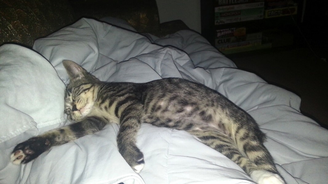 " Aggie did really well last night. He's very skiddish in the house but he's warming up to us. He enjoys being loved on and even started purring for us but he's torn between purring and meewing. He's so vocal!... He just needs time but he's coming around."