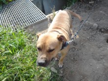 However, she's in poor living conditions, tied up outside day and night, having to walk around in her own waste. The owners feed this medium-large dog once a day, sometimes not even since they forget. Thankfully she gets daily visits from a guardian angel who donated her lovely pink jacket. But Gangja could definitely use a loving home.