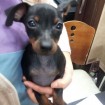 Kalilah (in Arabic means "bat") is a beautiful, super tiny, baby miniature pincher. She has the perfect, brown eyebrows and the beadiest little eyes. She enjoys cuddling underneath your neck for a good nap or digging her way underneath your blankets to sleep by your warm legs. Like many miniature pinchers she enjoys playing and chasing after toys, she is the perfect little puppy. She does extremely well with all dogs, BIG and small - i'm not sure she knows her size. ;P She is a bit shy when she meets new people, but she never barks at them... instead hides between the safety of mommy or daddy's legs.