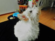 From Ringo's foster mom: "He's had a few accidents, but no chewing on anything really unless he's playing around. He's a good dog. He really is. Doesn't bark, and never bites. Just the occasional playful chew on my clothes. But I can tell he has some separation issues at the moment. When I leave or don't acknowledge him he makes some terribly sad whimpering noises. I know it will get better once more trust between us has developed and he knows I'm not abandoning him. Best of all is that he's gaining more confidence on the leash! We went on our second walk yesterday! He is still terribly shy around strangers at first, and if we pass by anyone he'll stop or maybe sit and wait till they pass. But when it's just the two of us we do fine (which isn't common in Korea). He sleeps all through the night too, which surprised me the most." If you are interested in this little ball of fluff, please contact me via email: [email protected].