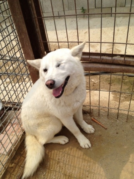 Angel is a beautiful one-eyed Jindo. She was living indoors with the smaller dogs, but has been moved to an outdoor kennel with 3 other dogs, including "Yeon-Ee" (the beagle). Angel is a very shy girl, and does seem to prefer females (human and canine). She seems to have come out of her shell a bit more since being moved outside. She will need a patient owner to work with her in becoming better socialized. But she is a very sweet girl, quiet small for a Jindo, and has very soft fur. I think she would prefer a forever home where she is the only dog, or with a laid-back female canine friend should work as well. Please consider this beautiful girl :)